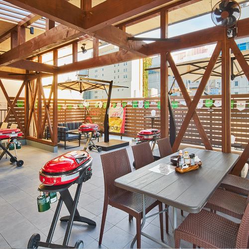 テラス席でBBQ♪お肉と野菜などを焼きながら楽しめます。全50品以上のドリンクが作れるセルフ飲み放題!